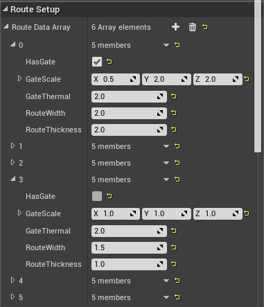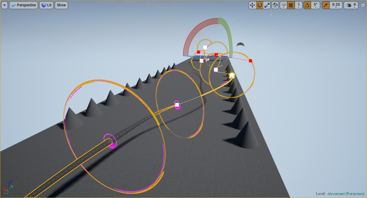 UE4 already has certain handy tools to create lines which I took advantage of, I made use of the spline library to let designers easily create the route. The spline I made was fully configurable, it would automatically generate a start and a endpoint which each partially handled the game logic for the player. Each spline point also could have a gate which could influence the thermic speed of the player and act as a checkpoint. Based upon the rotation to the next gate, I would also move the inner gates rotation to give the users a preview of the location of the next gate.