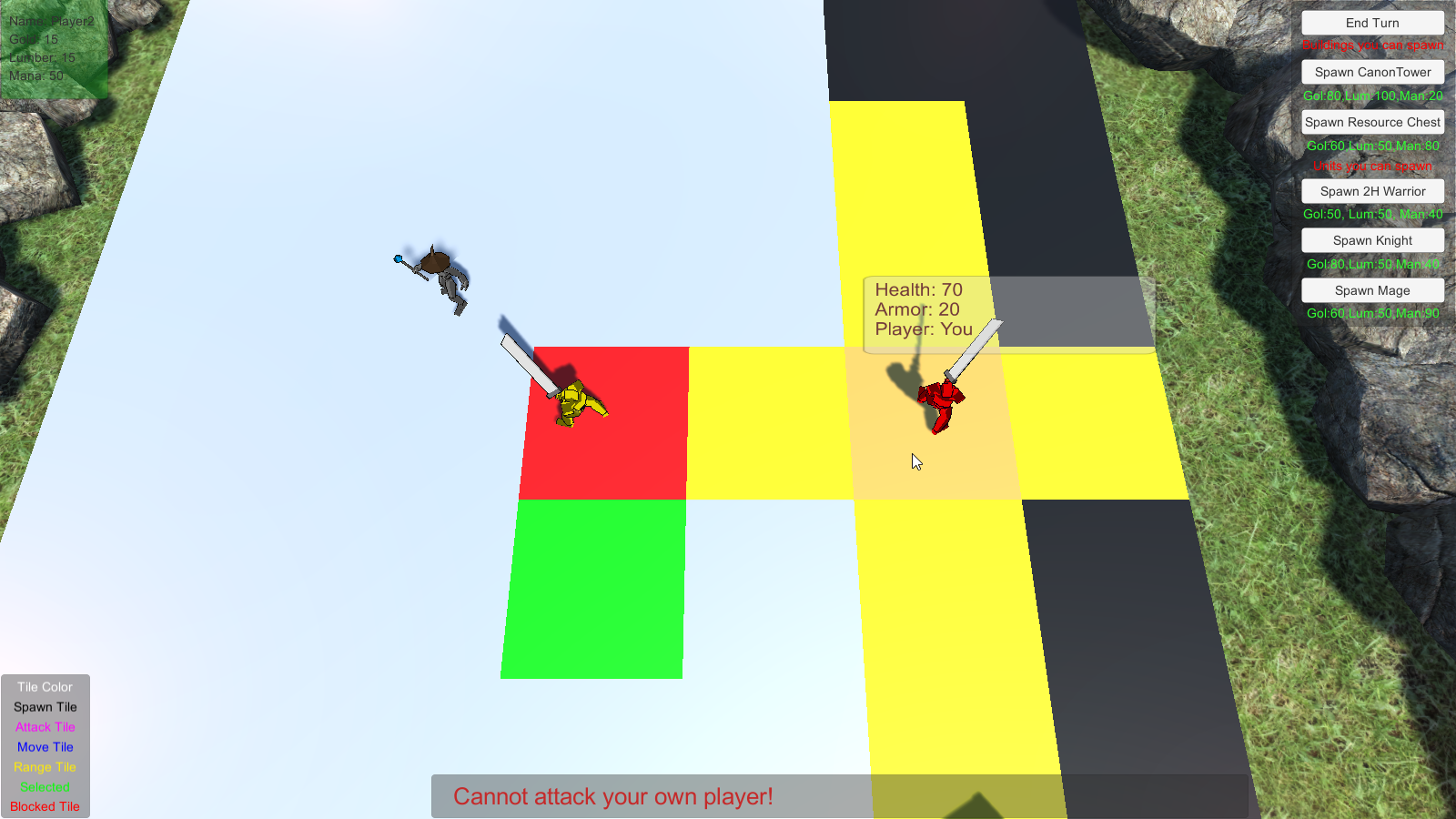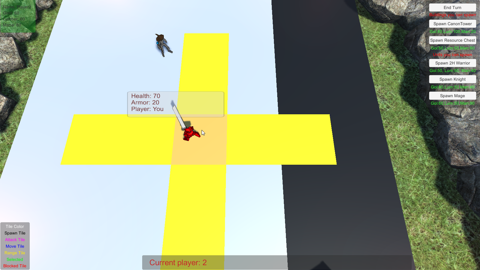 When a player has no more resources and all it’s buildings, warriors and objects have been destroyed, the other player will win the game. To prevent that from happening the player needs to have a good strategy to defeat the other player. Each object that the player buys has it’s advantage over other objects. For example a mage has an advantage over knights but is worse against 2H knights. Every object in the game also has a certain cross radius in which they can move or attack other objects. This will also influence the players decisions and strategies.