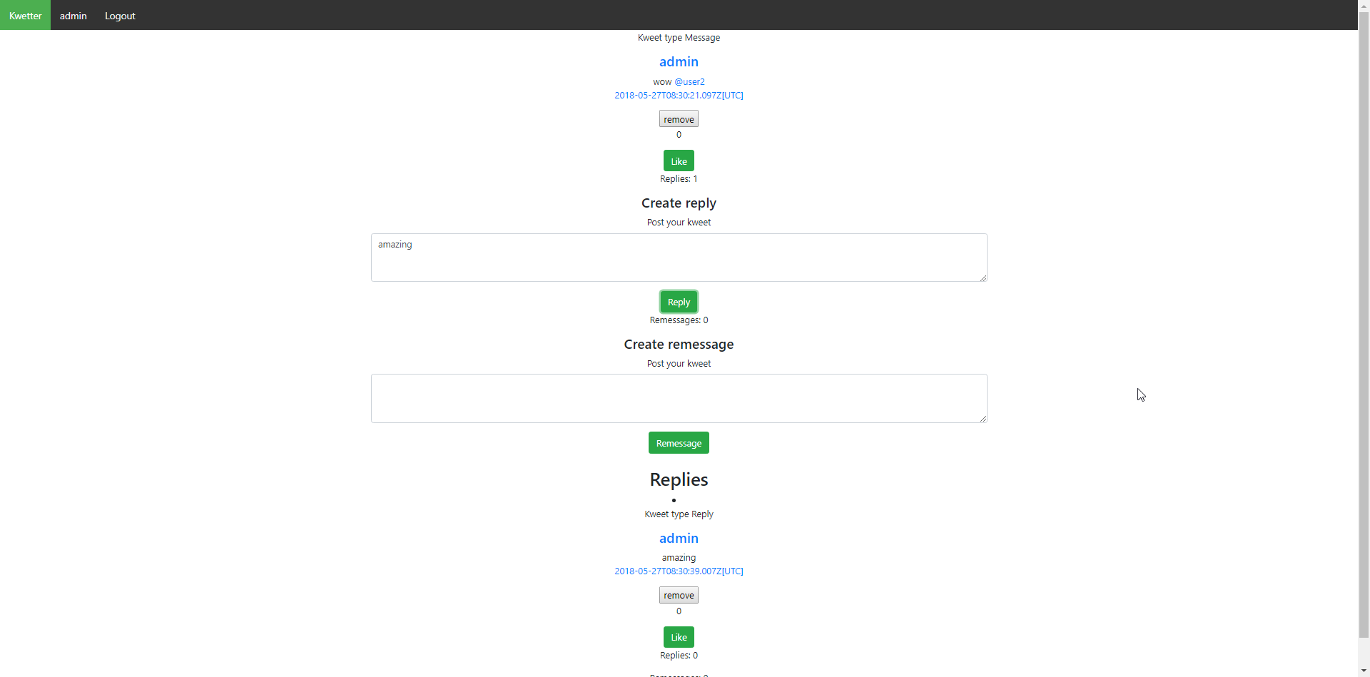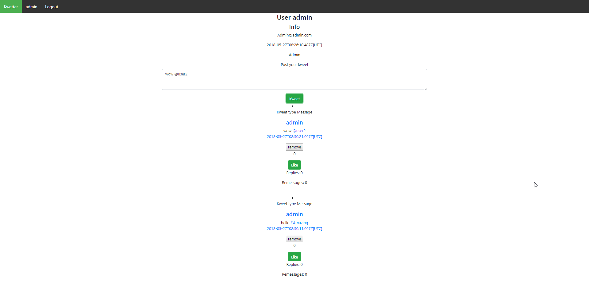 Kwetter is a Twitter like social media application I made during my sixth semester. I made this application to get familiar with Java EE and front end website frameworks like Angular. During the development of this application I learned a lot about Java EE and the capabilities of that framework.
